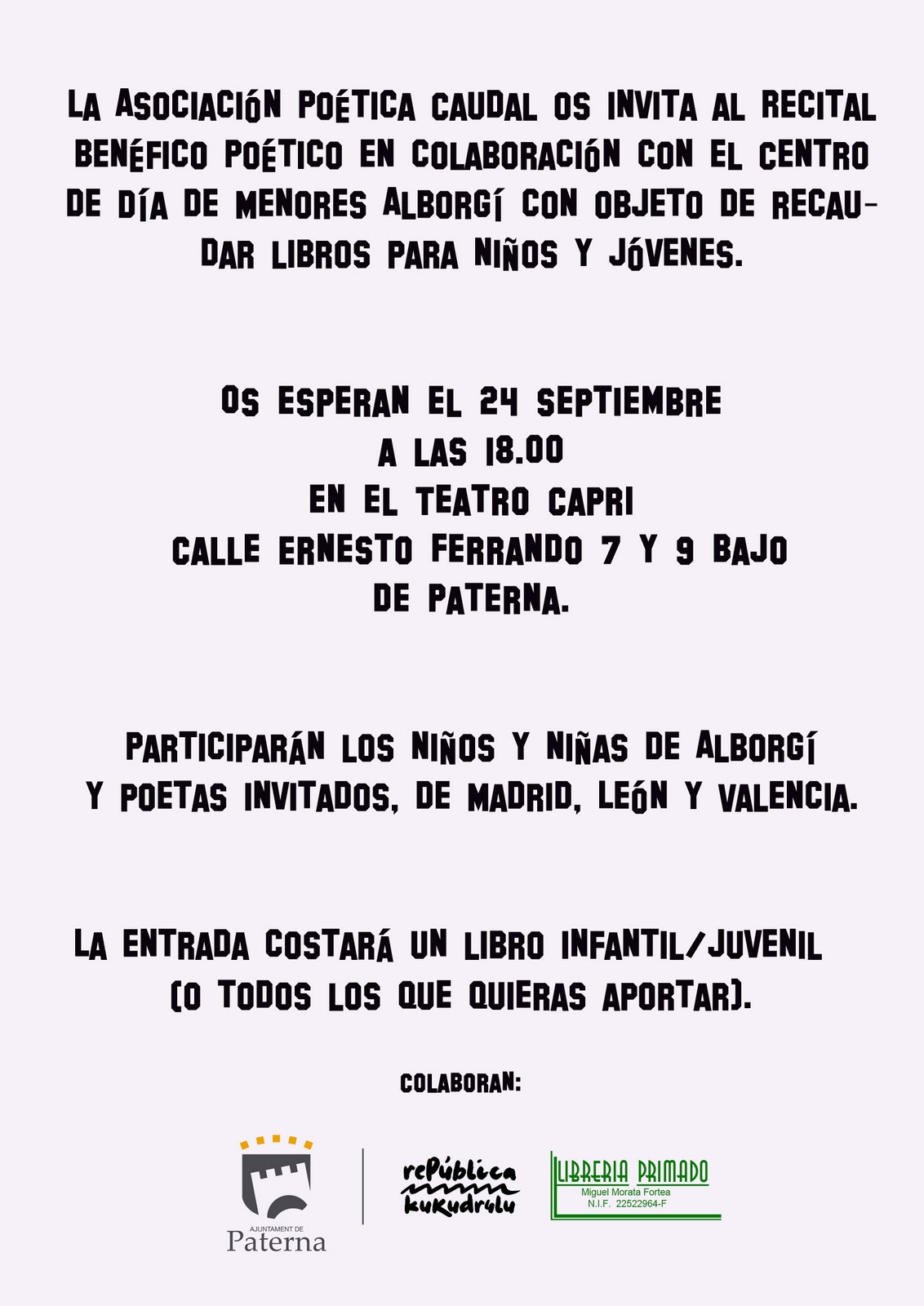 Estamos organizando un recital benéfico para recaudar libros para niños y jóvenes. En colaboración con el centro de día Alborgí (en Paterna,