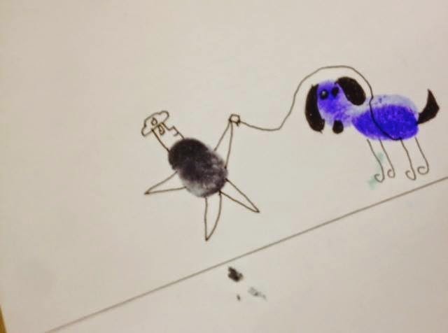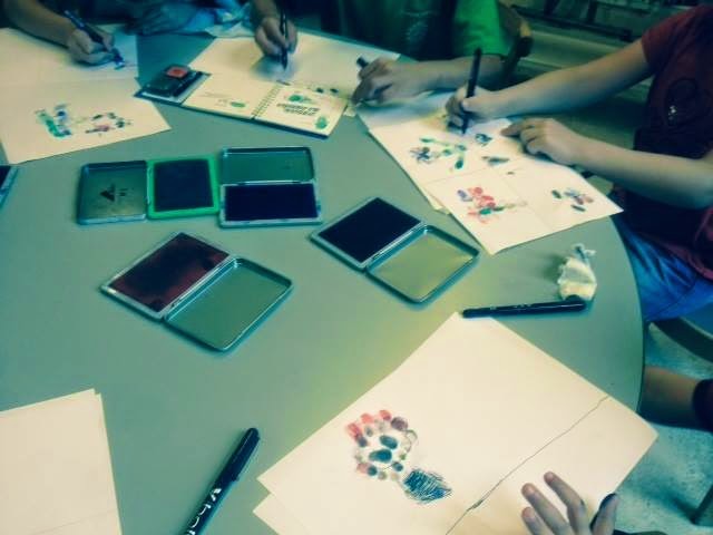 Después, basado en el libro El viaje, de Faber, editado por A buen paso, un taller para contar algo usando, solamente, imágenes. Lo más divertido es que los dibujos se hacen con las huellas de los dedos. Aquí tenéis algunas fotos de las dos sesiones que disfrutamos, una en el hermoso jardín de la biblioteca y la otra en el interiro, puesto que llovía.