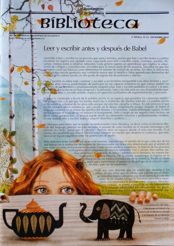 El número 61 de la revista BIBLIOTECA, de la Red de Bibliotecas de Salamanca, ya está impreso y llegando a todas las bibliotecas de España. Para mí es un absoluto honor que Isabel Sánchez Fernández me invitase a participar, la calidad de la revista y el ahínco por fomentar la cultura y la lectura en las BP de Salamanca es ejemplar. Os dejo mi participación en dicha revista esperando que os guste, y, si podéis, conseguid un ejemplar de la revista: